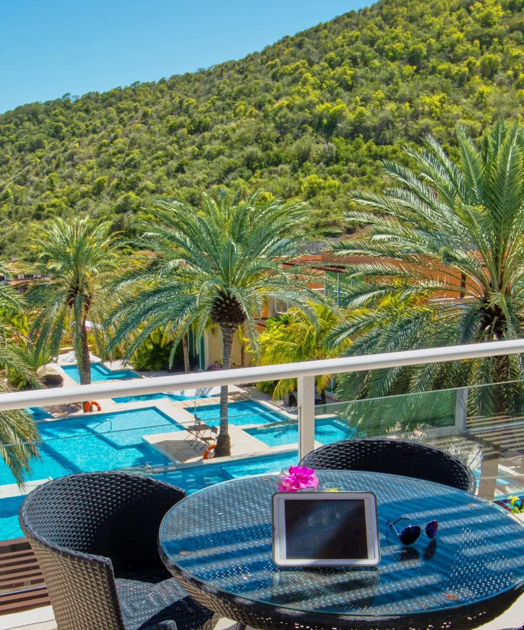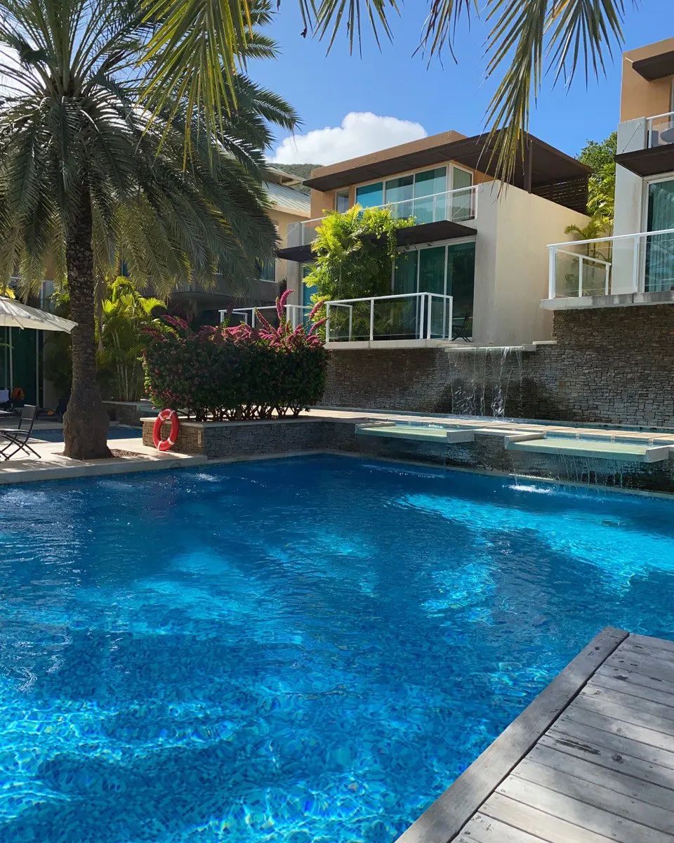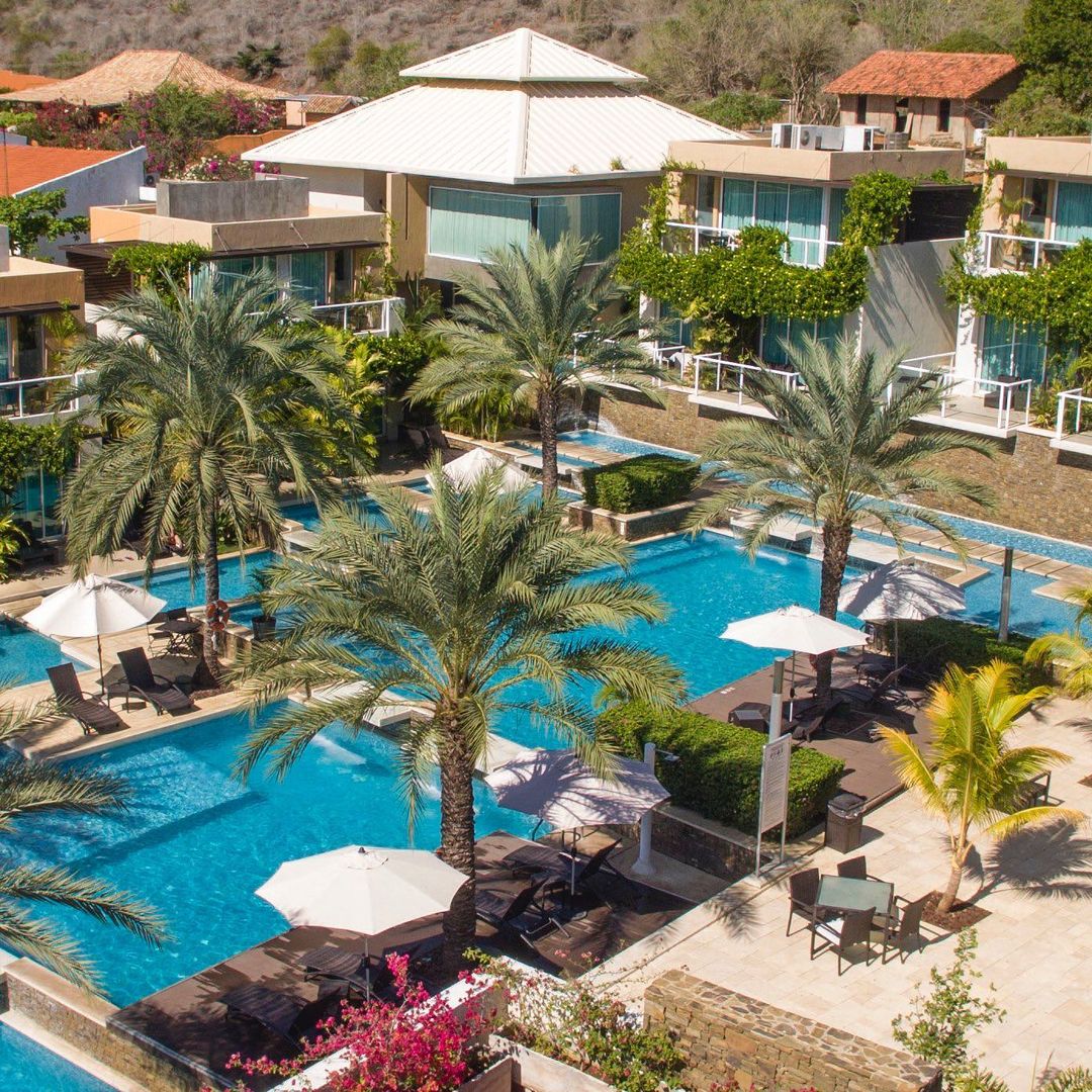 Las habitaciones rodean la piscina y a su vez parecen, por esta singular disposición, estar suspendidas en el agua.